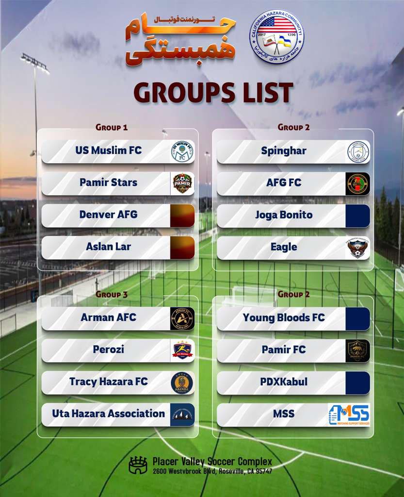 In Group A, Muslim America, Pamir Stars, Denver Afghan, and Aslanlar will compete. Group B includes Spin Ghar, Afghan, Joga Bonito, and Eagle. In Group C, the teams are Arman, Piroozi, Hazara Tracy, and Hazara Association of Utah. Group D features Young Bloods, Pamir, PDX Kabul, and MSS.
